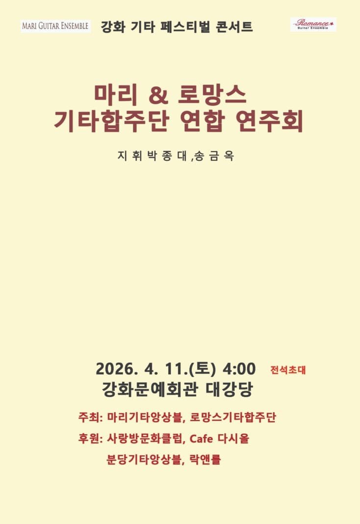 ‘마리 기타합주단’과 ‘로망스 기타합주단’은 오는 4월 11일 오후 4시 강화문예회관 대강당에서 연합 합주회를 개최한다. 이번 공연은 독주의 섬세한 선율부터 두 합주단이 함께 만들어내는 웅장한 앙상블까지 클래식 기타의 폭넓은 매력을 한자리에서 감상할 수 있도록 기획됐다.