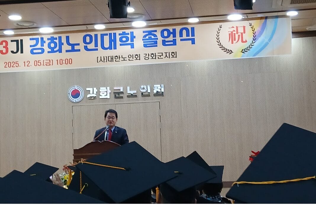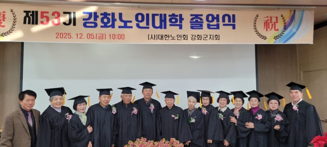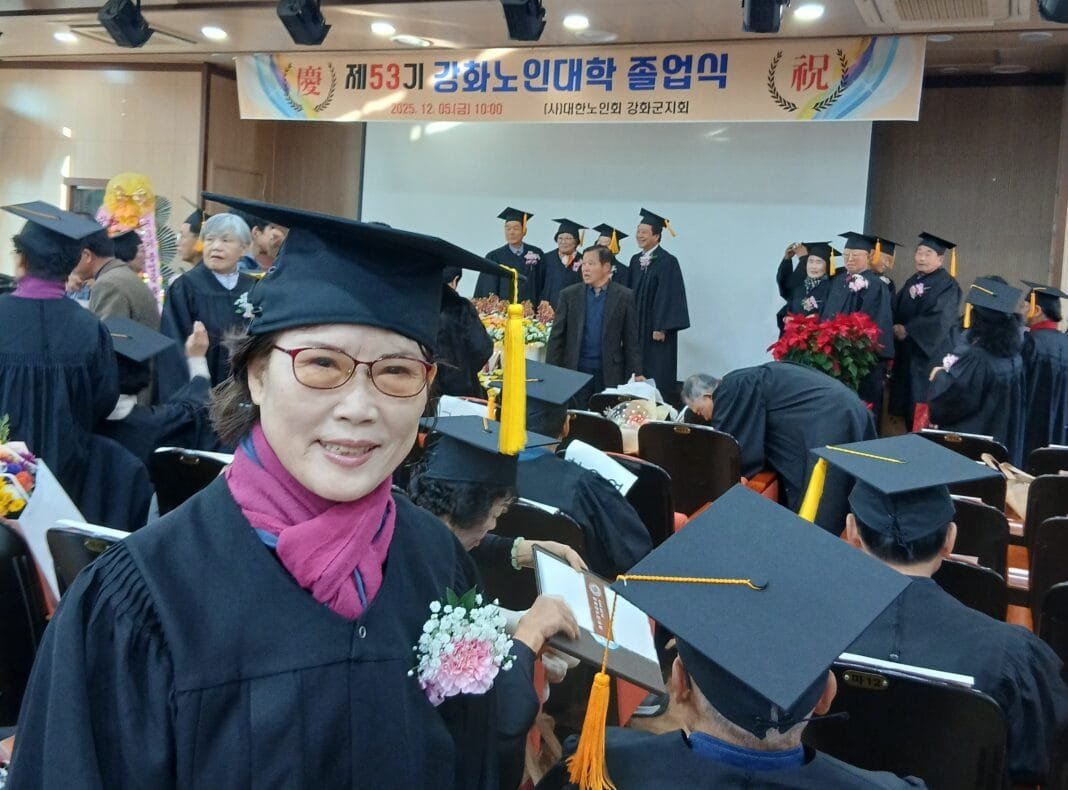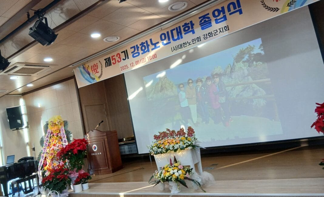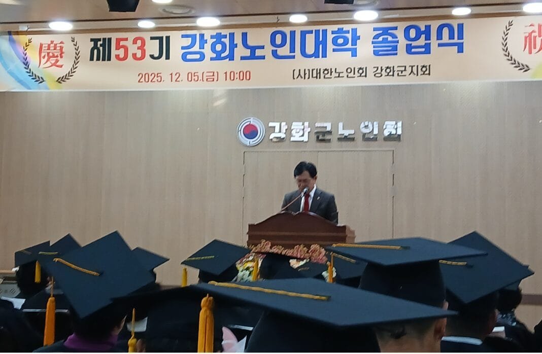 제53기 강화노인대학 졸업식은 사각모를 쓴 어르신들이 가족과 친지들의 축하 속에서 성대하게 마무리되며, 지역 노인 인재 양성 및 행복한 노후 생활의 중요성을 다시 한 번 확인하는 자리로 평가됐다.