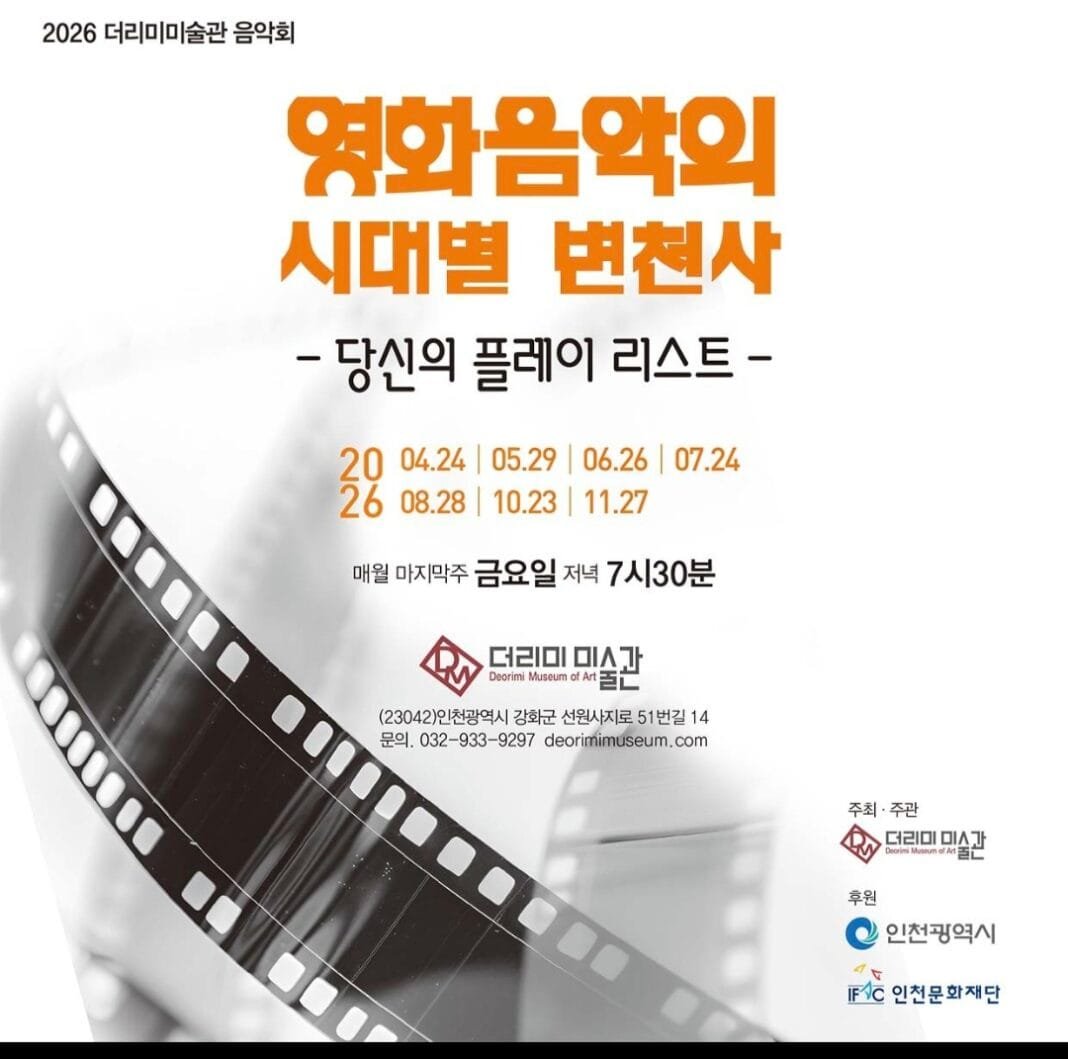 지난 24일 오후 7시 30분, 더리미미술관에서 ‘영화음악의 시대별 변천사 – 당신의 플레이리스트’라는 주제로 음악회가 개최됐다. 인천문화재단의 ‘작은 예술공간 지원’ 사업으로 10년째 이어져 온 이번 음악회는 올해 1950년대 영화음악을 조명하며 새로운 여정을 시작했다.